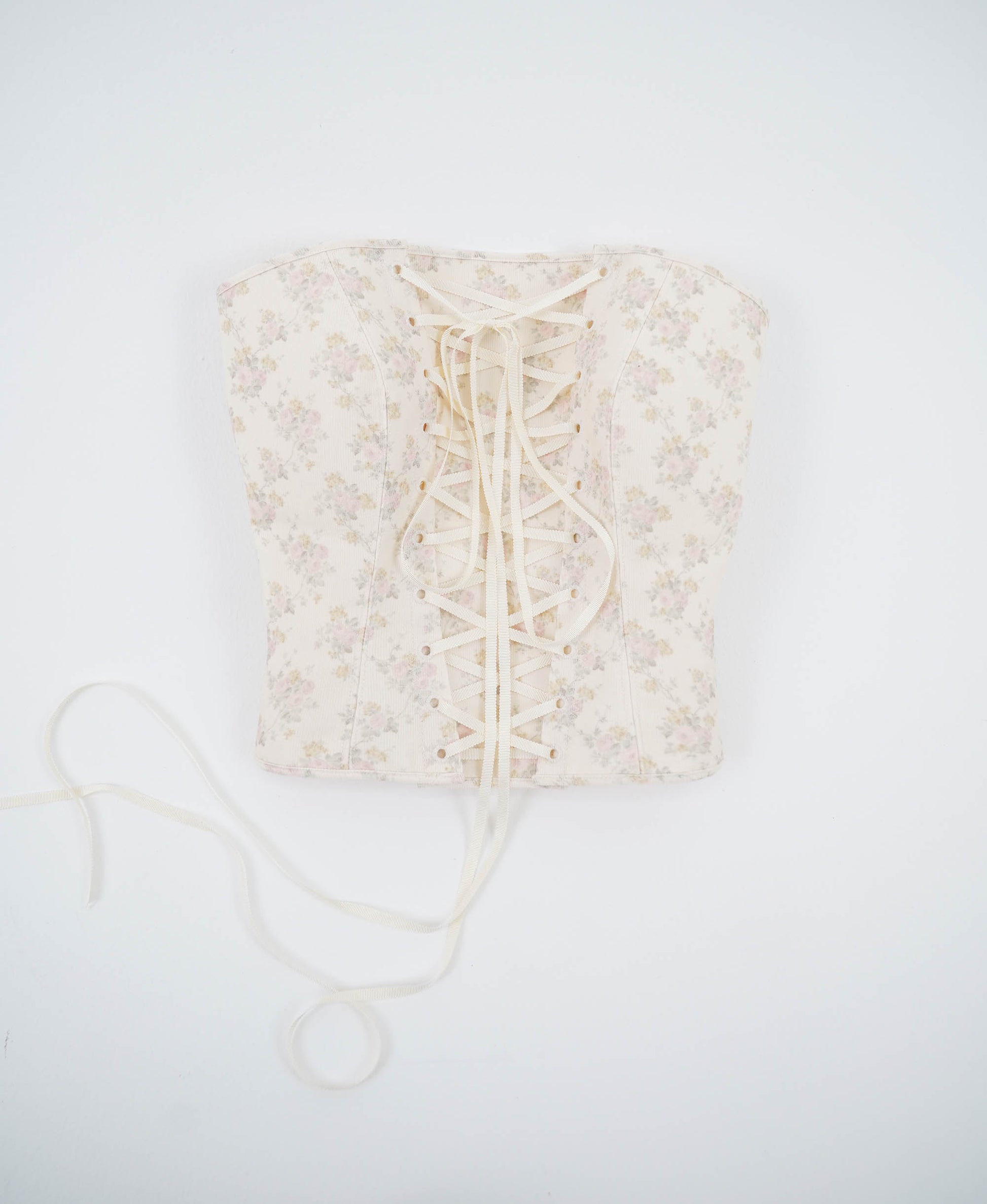 Wrap yourself in elegance with this corduroy corset top, delicately adorned with soft pastel florals that bloom across the fabric like a painting in springtime. The lace-up front detail adds a touch of romance, cinching the waist in a graceful silhouette while the subtle sheen of the material glimmers softly in the light. Feminine, dreamy, and endlessly versatile, this piece is designed to make every moment feel just a little more magical.